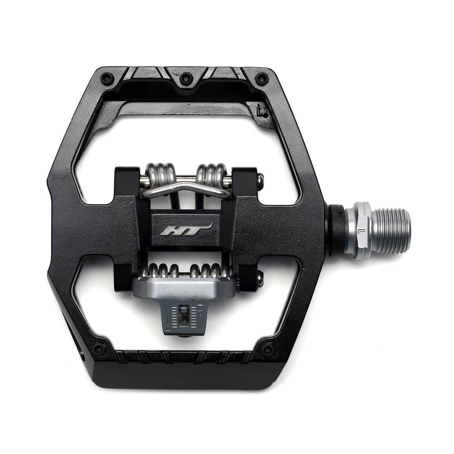 Double sided pedal, offering both the great HT ‘clipless’ binding system on one side, combined with a shoe biting flat alloy platform with grip pins on the other.